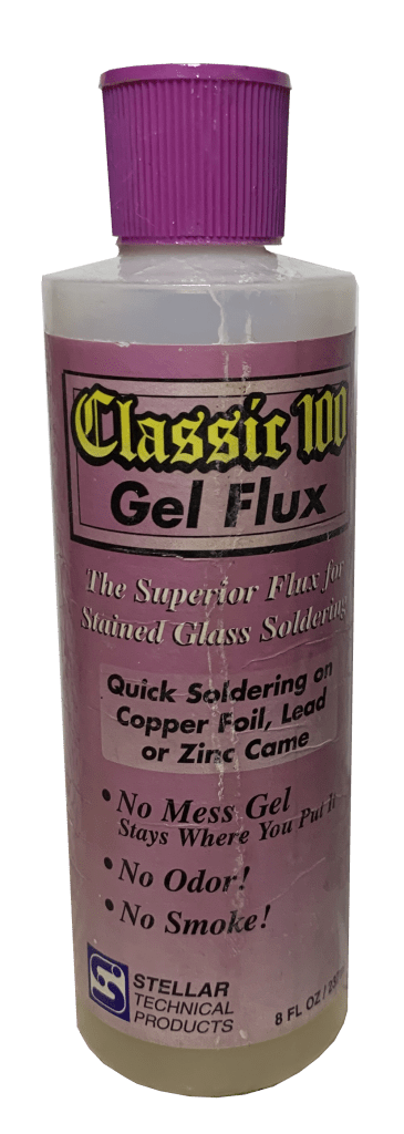 - Gel flux: My personal choice is water soluble gel flux when I work on stained glass. Gel flux can be easily controlled for precise application. Easy to apply with a swab or brush and stays where you put it. Also easy to clean off with soap and water.